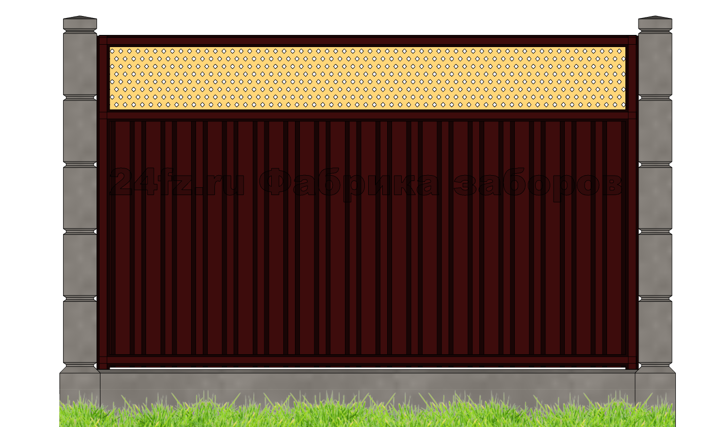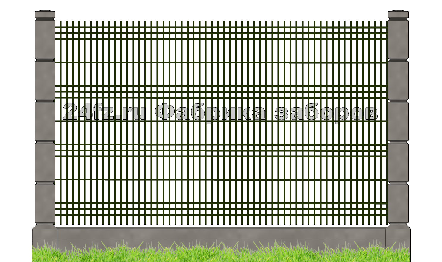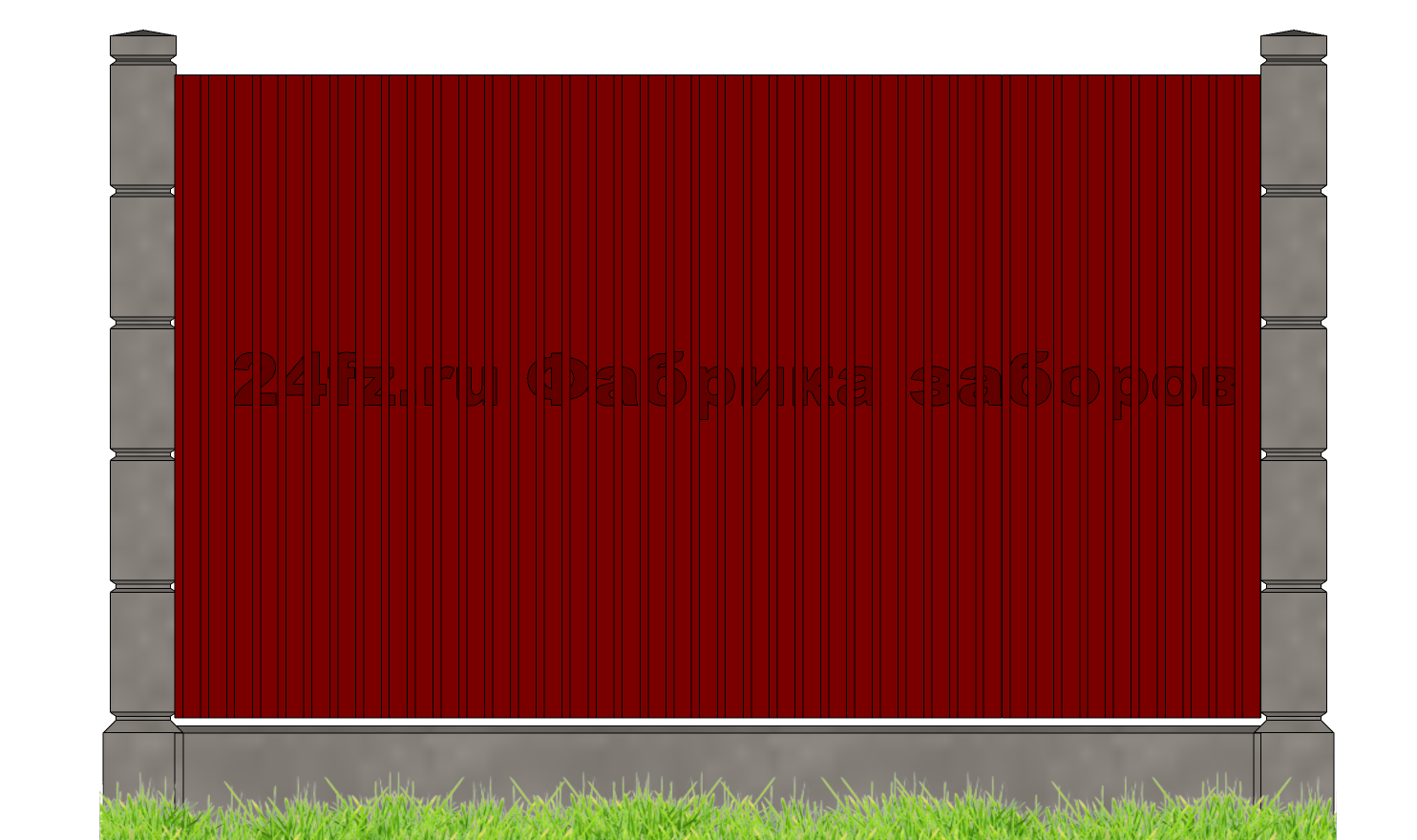 Классический вид забора с досками прямого реза в бетонной оправе из столбов и сборного фундамента высотой 2 метра и стандартной шириной пролёта 3 метра. Расстояние между досками и цветовое решение на ваш выбор.