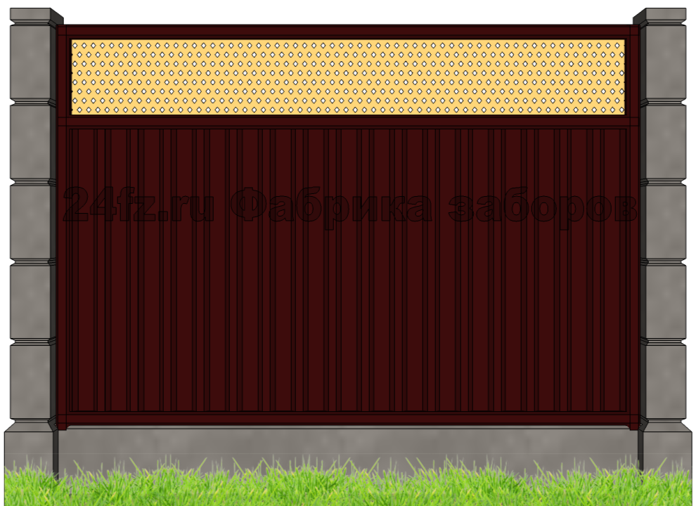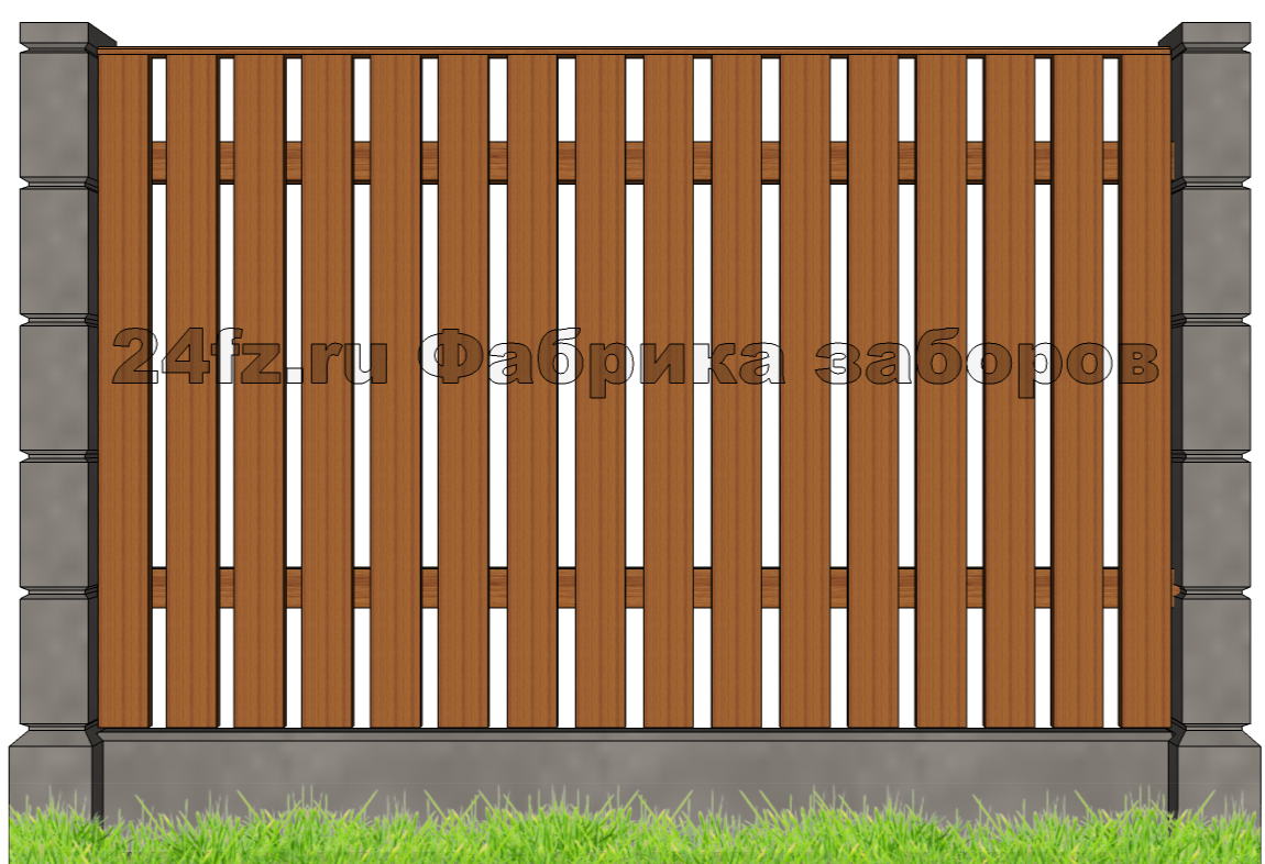 столбы и цокольные панели отлично комбинируются с секциями из дерева и металла